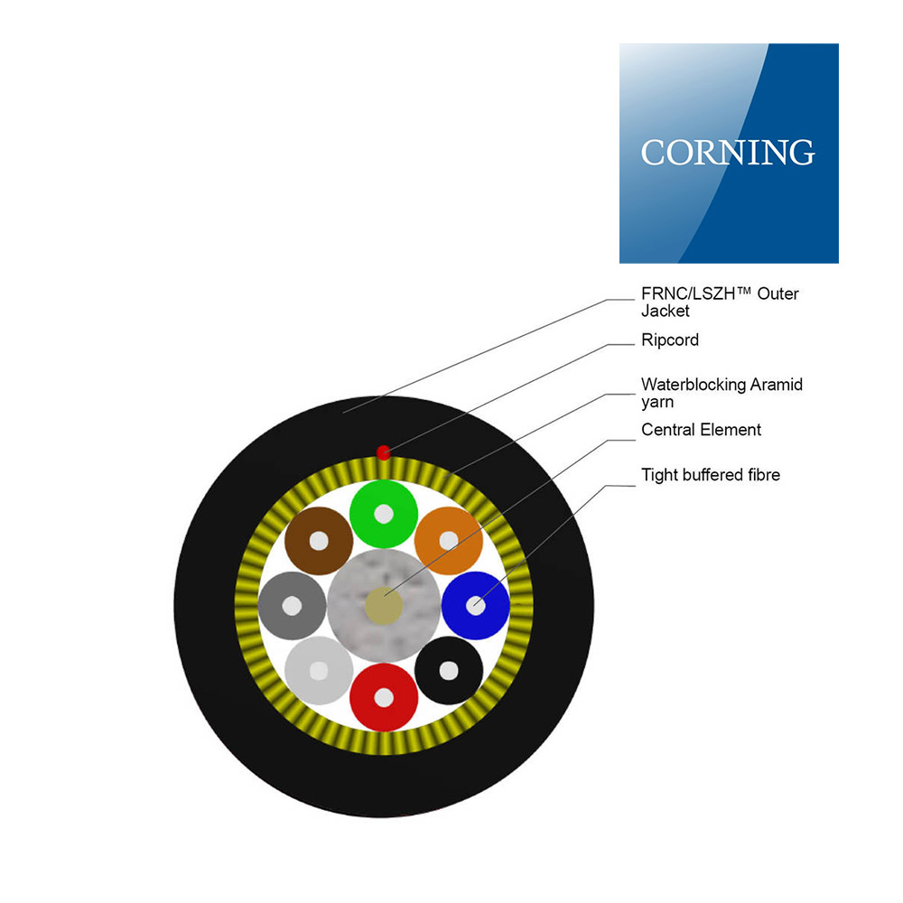 کابل فیبر نوری 8 کر سینگل مد کرنینگ CORNING با ساختار تایت بافر indoor / Outdoor با روکش LSZH و قایبلت نصب در داخل فضاهای مسقف با توجه به روکش مقاوم در برابر حریق، کم دود و خاموش شونده خودکار و همچنین برخورداری از استاندارد مقاومت در برابر آب و رطوبت مطابق IEC 60794-1-22 Method F5B جهت نصب در محیط های IN/OUT و انواع نصب در فضای بیرونی و فضای داخلی با توجه به خمش مناسب و عدم ایجاد افت در صورت خمش و مقاومت در برابر رطوبت تحت ساختار U-VQ(ZN)H شناخته می شود.